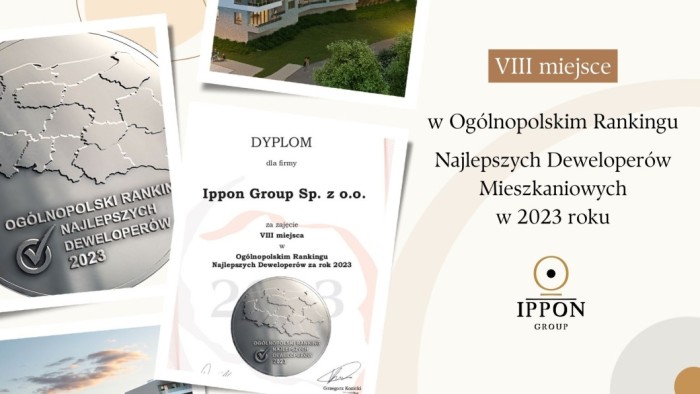 Dziennik Gazeta Prawna opublikował zestawienie Najlepszych Deweloperów Mieszkaniowych w Polsce w 2023r. Firma Ippon Group, już po raz trzeci znalazła się w czołówce rankingu, awansując na miejsce 8. Szczegółowej analizie zostały poddane m.in.: kondycja finansowa firmy, procesy obsługi klienta oraz zaangażowanie w działania charytatywne i prospołeczne.